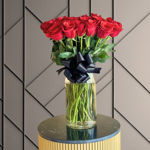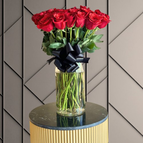A timeless arrangement of premium red roses, hand-selected for their rich color and freshness, elegantly styled in a clear glass vase and finished with a refined black ribbon. Perfect for romantic gestures, anniversaries, or classic interior styling.
