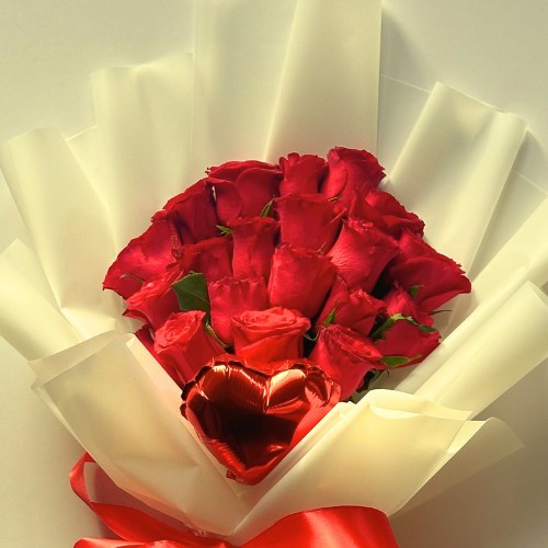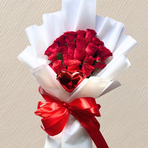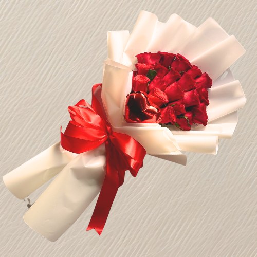 A delicate hand-wrapped bouquet of fresh red roses, wrapped in soft white paper and finished with a bold red ribbon and heart accent. Designed to express love in a pure, elegant way — perfect for Valentine’s Day, anniversaries, or heartfelt surprises.