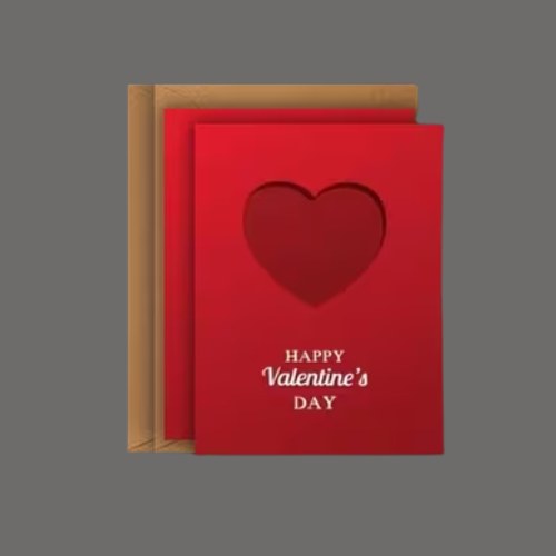 A timeless red Valentine’s greeting card featuring a heart cut-out design and “Happy Valentine’s Day” message. Perfect for adding a personal and elegant touch to flower arrangements and gift orders.